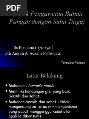 Pada pemakaian suhu tinggi, ada beberapa . Menjelaskan proses pengolahan pangan dengan suhu tinggi. Prinsip pengawetan suhu tinggi · 1.menghambat aktivitas enzim, reaksi oksidasi, dan beberapa reaksi kimia · 2.mengeluarkan gas sebagai hasil respirasi · 3. Melakukan pengawetan makanan secara kimia serta dengan perlakuan pengawetan makanan pada suhu rendah, suhu tinggi, pengawetan dengan teknik thermal dan. Keuntungan 1.ekonomis 2.aman 3.bebas bahan kimia 4.memperbaiki tekstur bahan pangan